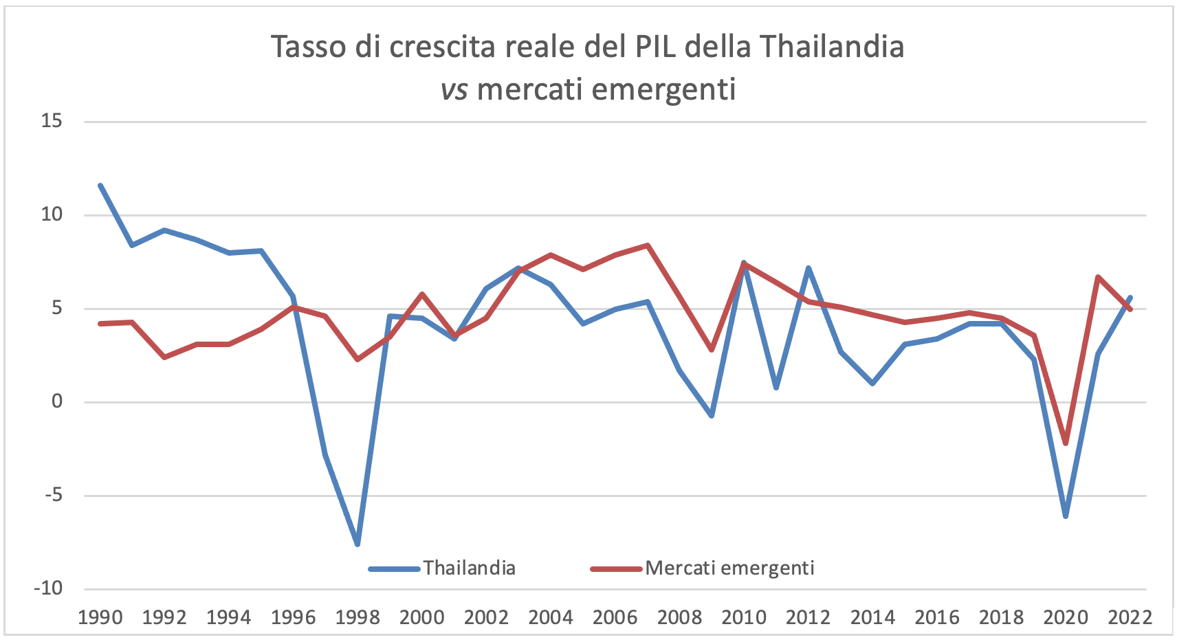 Fig. 1 – Tasso di crescita reale del PIL della Thailandia, paragonato con quello dei mercati emergenti (fonte: Fondo Monetario Internazionale: https://www.imf.org/external/datamapper/NGDP_RPCH@WEO/OEMDC/THA).
