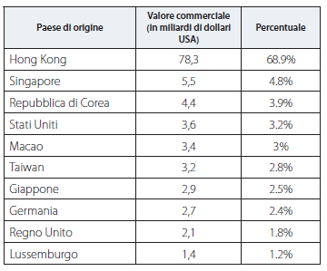 I primi dieci Paesi di origine degli IDE della RPC in entrata, 2016 (Fonte: Invest in China)