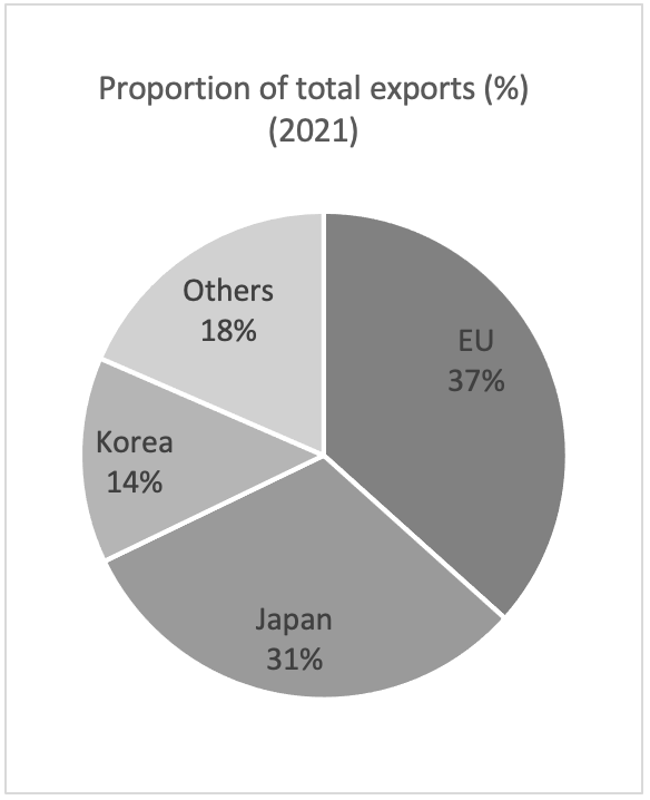 The garment export market is significant because it illustrates Myanmar’s key destination markets. Economic shocks produced by COVID-19 and the military coup have had an impact on the volume of exports and the market destinations. As shown in Figure 2a, UN ComTrade data shows the volume of garment exports between 2019 and 2020 experienced an overall decline of more than a quarter (-26%).